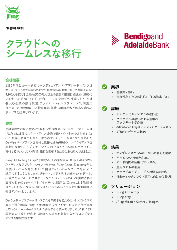 JFrog Artifactoryとx光により約500人の開発者が600以上のクラウドネイティブなアプリケーションでMaven, Ruby Gems,码头工人などの主要パッケージを含む15の個別のパッケージタイプを安全に活用できるようになります。