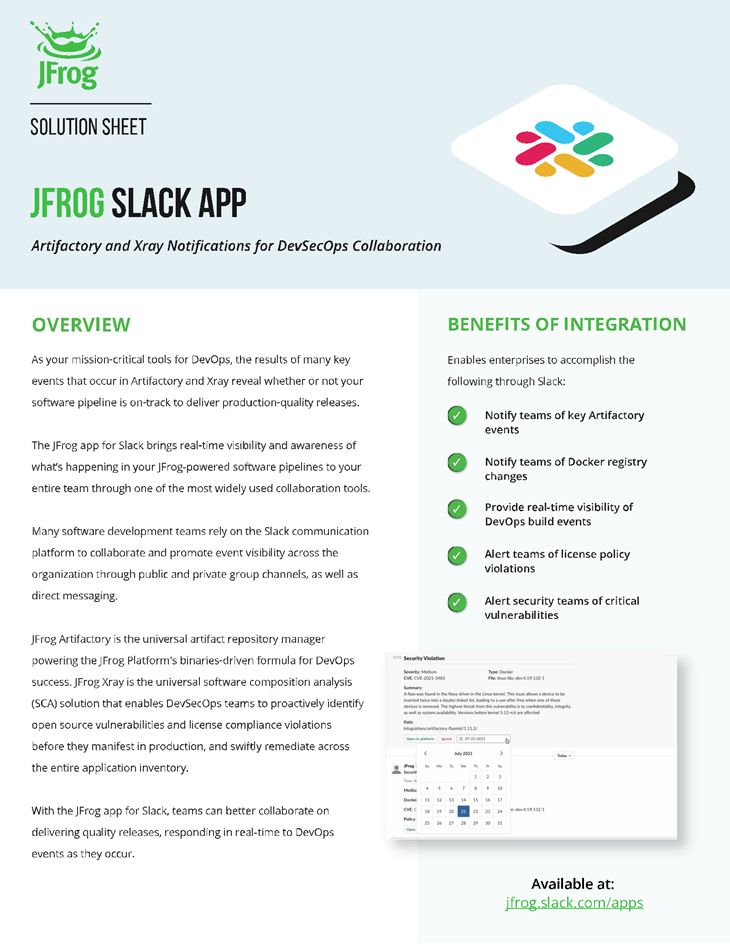 Slack的JFrog应用程序通过最广泛使用的协作工具之一,为您的整个团队带来实时可见性和对JFrog支持的软件管道中正在发生的事情的感知。