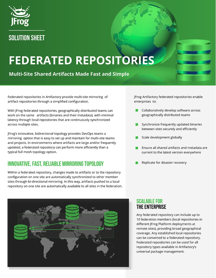 多个Artifactory部署中的本地存储库可以在逻辑上连接起来,作为联合进行同步,并为每个站点提供统一的、本地可访问的全局数据存储库。