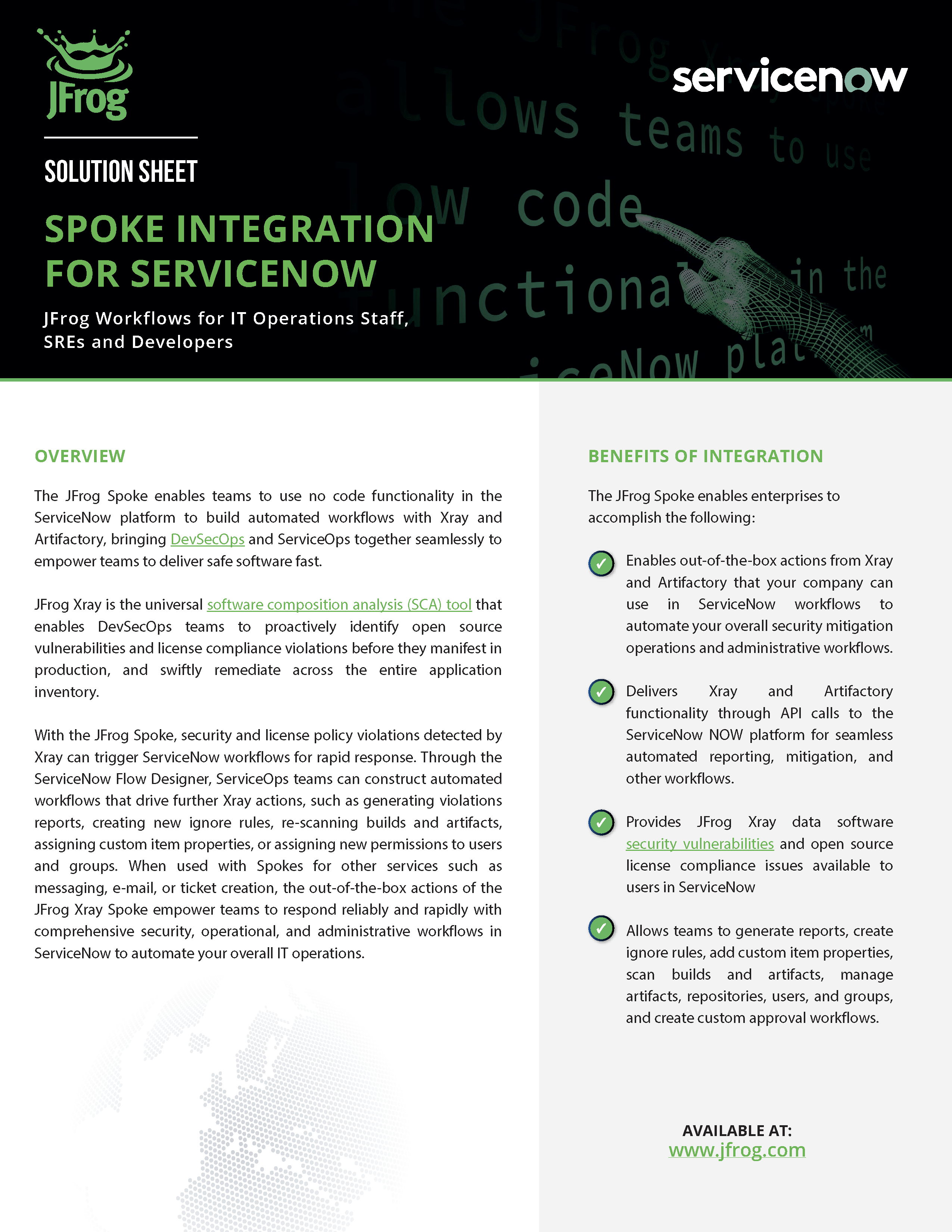 JFrog Spoke使团队无需使用ServiceNow平台中的任何代码功能,就可以使用Xray和Artifactory构建自动化工作流,将DevSecOps和ServiceOps无缝结合在一起,使团队能够快速交付安全的软件。