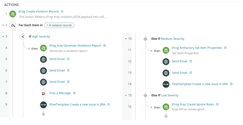 • 启用来自Xray和Artifactory的开箱即用操作,您的公司可以在ServiceNow工作流中使用这些操作来自动化您的整体安全缓解操作和管理工作流。