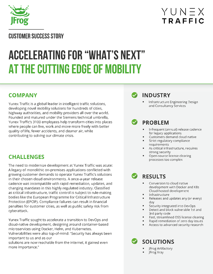 JFrog帮助Yunex Traffic为“下一步”做准备,使他们能够快速响应新的监管要求和零日漏洞,并按需提供高质量的微服务更新。“当log4j出现问题时,我们是在周五下午宣布的,(使用JFrog)到周一中午,我们已经在所有城市推出了补丁。”