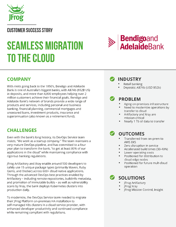 通过在内部部署和AWS安装之间联合存储库,银行能够将1TB的累积包、工件和二进制数据复制到AWS中的新云环境中。Artifactory中的这种双向镜像功能,以及通过JFrog Access Federation实现的用户令牌同步,使开发团队能够无缝地将其存储库的使用转换到AWS环境对日常运营零干扰。