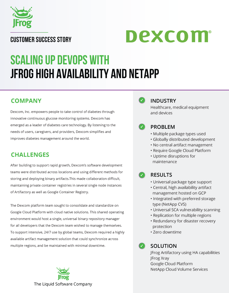 “最近,Dexcom在一个运行JFrog的节点上遇到了一个问题,我们关闭了该节点进行维护,而辅助节点则启动并运行。最终用户继续运行,没有停机时间或对性能的影响。”