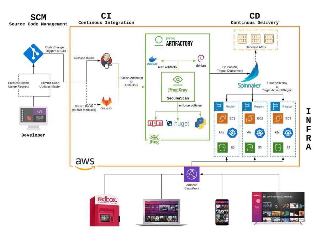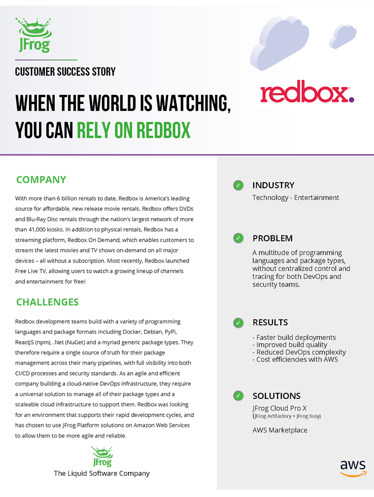 Redbox开发团队使用各种编程语言和包格式构建,包括Docker、Debian、PyPi、ReactJS (npm)、。net (NuGet)和无数的通用包类型。因此,他们需要一个单一的信息源来跨许多管道进行包管理,并对CI/CD过程和安全标准具有完全的可见性。作为一家构建云原生DevOps基础设施的敏捷而高效的公司,他们需要一个通用的解决方案来管理他们所有的包类型,并需要一个可扩展的云基础设施来支持他们。Redbox一直在寻找一个支持其快速开发周期的环境,并选择在Amazon Web Services上使用JFrog平台解决方案,以使其更加敏捷和可靠。
